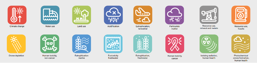 PEF计划用于取代产品碳足迹、产品水足迹等单项指标评价方法,所以它的评价指标一共包括16种资源环境影响类型,如气候变化、酸化、臭氧层消耗、水资源消耗、富营养化等。