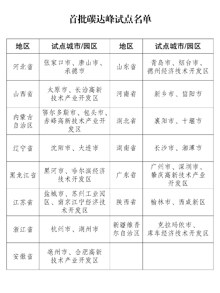 为落实国务院《2030年前碳达峰行动方案》(国发〔2021〕23号)有关部署,按照《国家碳达峰试点建设方案》(发改环资〔2023〕1409号)工作安排,经有关地区城市和园区自愿申报、省级发展改革委推荐、省级人民政府审核、国家发展改革委复核,确定张家口市等25个城市、长治高新技术产业开发区等10个园区为首批碳达峰试点城市和园区,现予公布,并就有关事项通知如下: